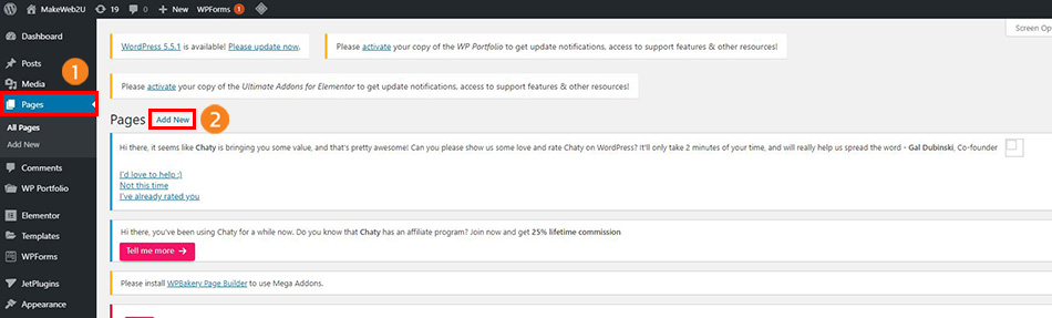 1.คลิกที่ Pages จากนั้นคลิก Add New