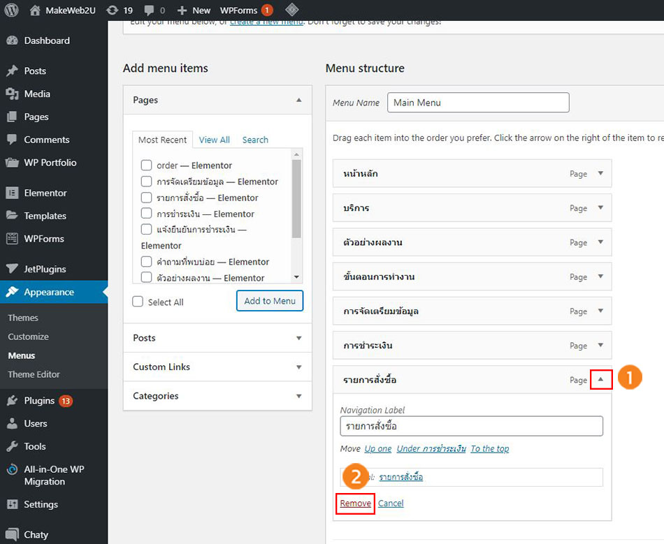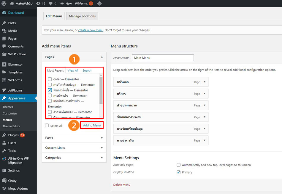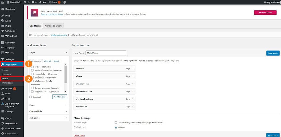 2. คลิกที่ Appearance จากนั้นคลิกที่ Menus