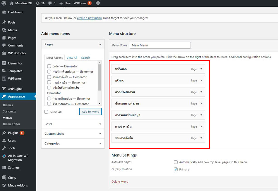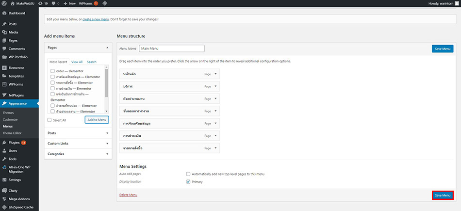 5. คลิกที่ Save Menu เป็นการบันทึกการเพิ่มเมนู